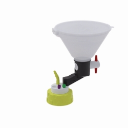 Schraubkappen mit frei drehbarem Einsatz aus PTFE. Je nach Ausführung, zum Anschluss von Kapillaren (AD 1,6/2,2/3,2 mm) und Schlaucholiven für Schläuche ID 5,5 bis 8 mm. Am Innengewinde GL 14 kann ein b.safe Abluftfilter eingeschraubt werden (nicht im Lieferumfang enthalten). Der Einfülltrichter aus PP hat einen integrierten Absperrhahn. Der Absperrhahn mit Griff wird durch Drehen des Griffes geöffnet, die Griffstellung zeigt an, ob der Hahn verschlossen ist. Der Absperrhahn Automatik wird durch Drücken des Griffs geöffnet und durch Loslassen des Griffes wieder verschlossen.