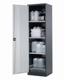 Lieferumfang: Chemikalienschrank CS-CLASSIC Modell CS.195.105 oder CS.195.054 inkl. Inneneinrichtung mit 3 Fachböden, Bodenauffangwanne mit Lochblecheinsatz als erste Stellebene